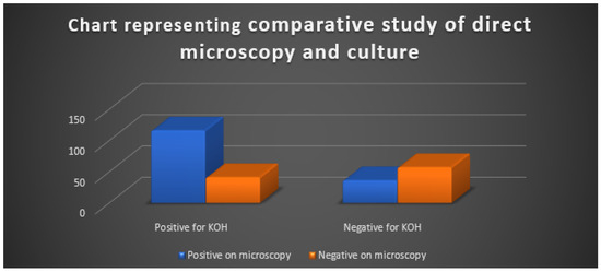 The KOH preparation used in our experiment showed good sensitivity when compared to the culture. These findings are comparable to Karmakar et al.’s prior research findings. Bindu et al. [25] and Singh et al. reported KOH sensitivity [26]. Twenty instances had favourable microscopy results but negative results from cultures. This variance may be brought on by the nonviability of fungal components in some circumstances and the inadequate sample brought on by the extremely small lesions.