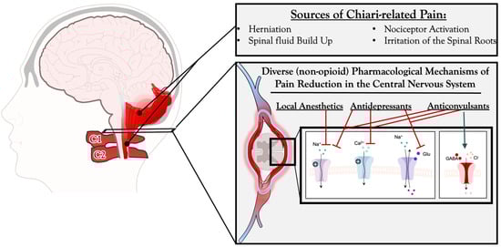 Chiari malformation comprises a range of cranial abnormalities at the junction of the skull with the spine, commonly affecting the posterior fossa and hindbrain [1]. It is characterized by the caudal herniation of the cerebellar tonsils below the foramen magnum and is frequently associated with syringomyelia [2]. Clinically, the presentation of CM differs amongst adult and pediatric patient populations. However, the most common presenting symptom of CM, across all patients, is pain and/or headache within the occipital and cervical region, exacerbated by routine Valsalva activities including coughing, sneezing, or laughing [3,4]. At present, it is believed that general irritation of spinal roots, particularly at the level of C1 and C2, along with irritation of nociceptors in the dura and/or blood vessels at the base of the skull, is what can lead to the pain and occipital headaches described by patients with CM. Specifically, the dorsal horn neurons that receive nociceptive information from the posterior/occipital dura are located in the C2–C4 spinal cord segments. These neurons’ cutaneous and muscle receptive fields are centered around the ears, occipital and upper neck skin, and superficial and deep neck muscles. In addition, disruption of the natural flow of cerebrospinal fluid around the herniated tonsils and the subsequent mass effect of the herniation have also been implicated as causative mechanisms of Chiari-related pain [5].