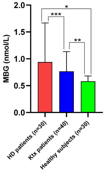 Median (IQR) circulating MBG levels in Ktx patients as compared with matched haemodialysis patients and healthy controls. * p < 0.0001; ** p = 0.0005; *** p = 0.02.