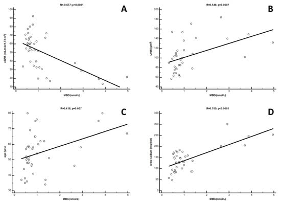 From the univariate analysis, a strong inverse correlation was found between circulating MBG levels and eGFR values (R = −0.677; p < 0.0001). Conversely, robust direct correlations were found with urinary sodium excretion (R = 0.700; p < 0.0001), LVMi (R = 0.543; p = 0.0007) and age (R = 0.418; p = 0.007) (Figure 2), while a barely significant correlation was found with gender (Rho = 0.319; p = 0.04). In a multivariate model including all the univariate predictors of MBG, only the correlations with urinary sodium (β = 0.423; p = 0.01) and eGFR (β = −0.324; p = 0.02) were revealed as independent, while those with LVMi, age and gender were lost. This model was rather robust, explaining about 70% of the overall variation of MBG in this study cohort (p < 0.0001). Interestingly, LVMi re-emerged as a significant predictor of MBG after excluding eGFR from this model (β = 0.404; p = 0.02). Table 2 summarises data from uni- and multivariate analyses of MBG.