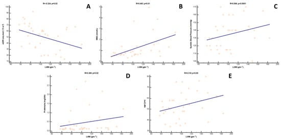 Univariate correlations between LVMi and (A) eGFR, (B) MBG, (C) systolic blood pressure, (D) proteinuria and (E) age in Ktx patients.