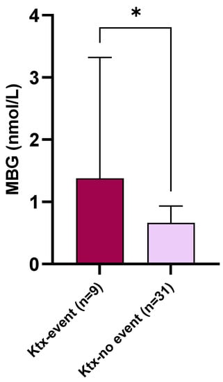 Baseline circulating MBG levels in Ktx patients experiencing the combined cardio-renal endpoint as compared with others. * p = 0.02.
