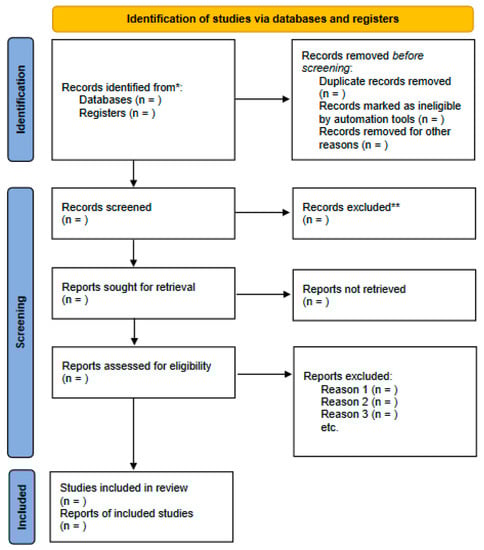 Flowchart of the screening process for this systematic review. * Consider, if feasible, reporting the number of records identified from each database or register searched (rather than the total number across all databases/registers). ** If automation tools were used, indicate how many records were excluded by a human and how many were excluded by automation tools.