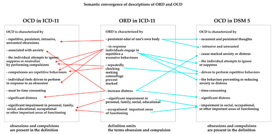 Olfactory phenomena were also regarded as persistent sensory delusional disorders (German: Sensitiver Beziehungswahn), which again distances them from OCD [15]. Both ORS and olfactory obsessions have been neglected in the ICD-10 classification [2]. In the expert guidelines to the ICD-11, Veale and Matsunaga (2014) suggest: “A co-occurring diagnosis of OCD is made only when obsessions are not limited to sniffing concerns” [19]. Finally, the ICD-11 assigned olfactory intrusions the title Olfactory Reference Disorder (ORD). It is defined as follows: “persistent preoccupation with the belief that one is emitting a perceived foul or offensive body odour or breath that is either unnoticeable or only slightly noticeable to others. Individuals experience excessive self-consciousness about the perceived odour, often with ideas of reference. In response to their preoccupation, individuals engage in repetitive and excessive behaviours such as repeatedly checking for body odour or checking the perceived source of the smell, or repeatedly seeking reassurance, excessive attempts to camouflage, alter, or prevent the perceived odour, or marked avoidance of social situations or triggers that increase distress about the perceived foul or offensive odour. The symptoms are sufficiently severe to result in significant distress or significant impairment in personal, family, social, educational, occupational or other important areas of functioning”. Although classified as an OCD-related disorder, the terms obsession/compulsion were not used. The diagnostic criteria only refer to body odor. The ICD-11 distinguishes three types of Olfactory reference syndrome: with fair to good insight (6B22.0), with poor to absent insight (6B22.1) and unspecified (6B22.Z). They are identical to the types of OCD [31]. DSM 5 did not address the issue of ORS as such. In this classification, olfactory symptoms are included in “Other specified OCD” as Jikoshu-kyofu (300.3). The olfactory symptoms here again concern only the fetor of one’s own body: “characterised by fear of having an offensive body odor” [1,3,10,32]. Figure 1 shows the significant semantic similarity of the ORD description compared to existing OCD definitions.
