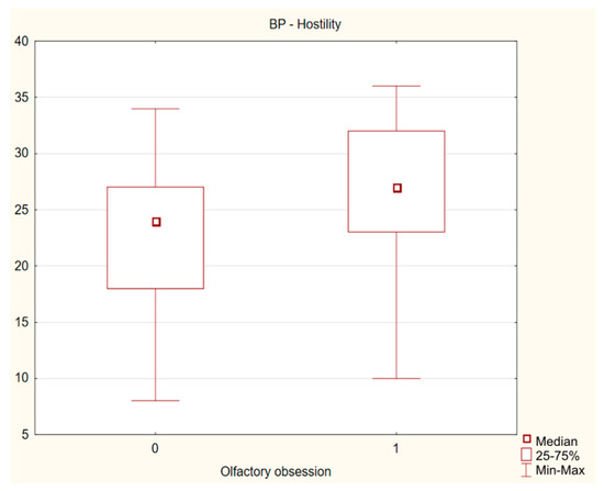 Difference in severity of hostility between OCD patients with and without olfactory obsessions.