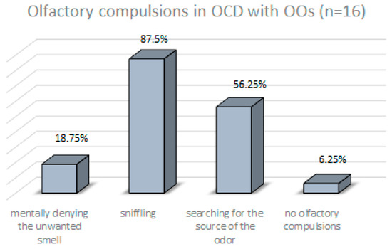 The vast majority of subjects in group with OOs (87.5%) reported that olfactory obsession caused discomfort (distress), which was most often associated with irritability (68.75%), anxiety (62.5%), mental tension (50%) and embarrassment (25%). One person (6.25%) was unable to specify the emotions caused by OOs. Olfactory obsessions were most often related to body/clothing odors (50%), odors of organic secretions (37.5%) and odors of chemicals (31.25%). Among others, food (25%), dirt (12.5%), animals (6.25%) and smoke (6.25%) were identified. The most common compulsions studied in response to olfactory obsessions are shown in Figure 4. It is worth noting that compulsions associated with OOs did not occur in the group of patients without OOs (n = 59, olfactory compulsions = 0).