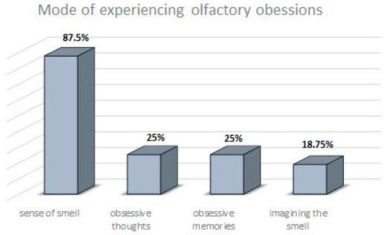 87.5% subjects of OCD with OOs reported that they experience OOs primarily through the sense of smell, and 62.5% respondents answered that this is the only modality in which they perceive these symptoms (OOQ item 4: “Sniffing that smell”). The odor experience was also associated with obsessive thoughts (25%), obsessive memories (25%) or images (18.75%). Two patients considered olfactory obsessions to be experienced in thought and without sensory recognition per se (response in OOQ item 4: “Thinking about this smell”—1; “Remembering this smell”—1, respectively). These findings are shown in Figure 5.
