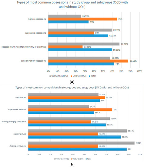 The results for the most common obsessions among the total study group were: contamination obsessions (72%), obsession with need for symmetry or exactness (69.33%), and aggressive obsessions (65.33%). The most common compulsions were: checking compulsions (88%), repeating rituals (82.67%), and ordering/arranging compulsions (69.33%). In the group with OOs, the most frequently observed obsessions were: contamination obsessions (87.50%) and magical obsessions (75%). The most common compulsions were: superstitious behaviors (75%), mental rituals (68.75%), checking compulsions (62.50%) and repeating rituals (62.50%). Correspondingly, the most common obsessions in the group without OOs were: obsession with need for symmetry or exactness (77.97%), aggressive obsessions (69.49%), and contamination obsessions (67.80%). In terms of compulsions: checking compulsions (94.92%), repeating rituals (88.14%), ordering/arranging compulsions and (72.88%), and mental rituals (62.71%). In a comparison of the two study groups, patients with OOs were more likely to experience magic-type obsessions, while this type of obsession was less common in those without OOs (chi2 = 7.933; p = 0.005). A lower prevalence of obsessions related to the need for symmetry and order was observed among those with OOs. In subjects without OOs, the presence of such obsessions was significantly more frequent (chi2 = 9.694; p = 0.004). The results are shown in Figure 6a,b.