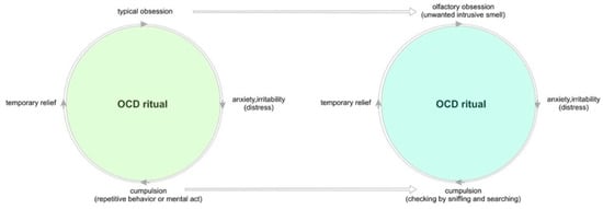 Olfactory obsessions occurred in sixteen of the seventy-five OCD patients assessed, which can be considered common (21.33%). We also confirmed the primary research hypothesis: OOs are not phenomenologically different from other obsessions. Thus, OOs share all the traits of a typical obsession: they are unwanted, intrusive and persistently recurring. They also cause such severe discomfort (87.5% of patients with OCD and OOs) that compulsive behaviors are the only method of obtaining temporary relief (93.75% of OO patients), which corresponds to the cited observations of Żerdziński (2008) and Ferrao (2012) [5,9]. It is relevant that the compulsions found in the group with OOs (sniffing, searching for the source of the odor, mentally denying the unwanted odor) were very closely related to olfactory obsessions and did not occur in those without OOs (100% vs. 0%). In addition to the metric scores, all investigators also monitored patients’ emotional reactions while completing the OOQ. Every subject experiencing OOs considered these symptoms to be an integral part of the clinical picture of OCD and showed no surprise or doubt about the diagnostic questions on the OOQ form. Figure 7 shows the identity of the pathomechanisms occurring in OCD with OOs and in typical OCD.