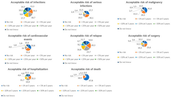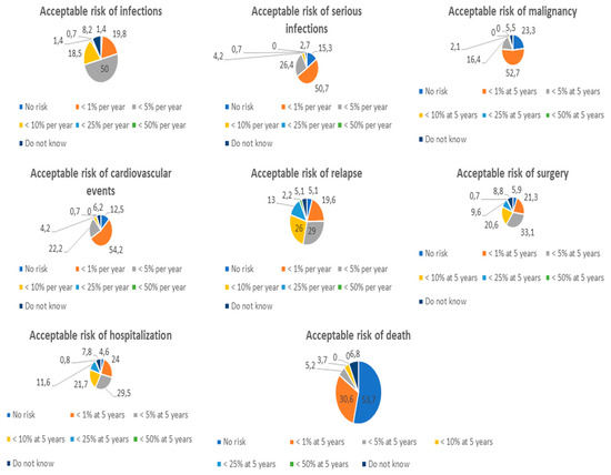 The risk of infections (316, 86.1%) and serious infections (332, 90.5%) were key aspects to consider before starting a new therapy. Of note, the acceptable risk of infections per year was highly variable, ranging from no risk (42/316, 13.3%), to <1% (51, 16.1%), <5% (59, 18.7%), <10% (56, 17.7%), <25% (31, 9.8%), and <50% (32, 10.1%), or unknown (45, 14.3%) (Figure 1). On the other hand, most of the respondents accepted no risk of serious infections (92/332, 27.7%), a risk of <1% per year (100, 30.1%), or <5% per year (64, 19.3%). The risk of malignancy (332, 90.5%), cardiovascular events (326, 88.8%), death (317, 86.4%), disease relapse (316, 86.1%), surgery (305, 83.1%), and hospitalization (281, 76.6%) also needed to be assessed for the majority of patients. For most subjects (138/332, 41.6%) a new therapy had to be associated with no risk of malignancy. However, approximately one-quarter of patients (88, 26.5%) considered a 5-year risk of < 5% to be acceptable, while a lower percentage of subjects were willing to accept a risk of <5% at 5 years (44. 13.3%), <10% at 5 years (9, 2.7%), <25% at 5 years (3, 0.9%), or <50% at 5 years (5, 1.5%). The risk of cardiovascular events was unacceptable in one-third of cases (110/326, 33.8%), but about half of the patients considered a risk of <1% per year (103, 31.6%) or <5% per year (52, 16.0%) to be acceptable. The tolerable risk for hospitalization and surgery was highly variable with most patients accepting a risk of <1% at 5 years (71/281, 25.3% and 78/305, 25.6%, respectively). Similarly, there was no agreement on the risk of disease relapse, but the majority tolerated a risk of <5% per year (75, 23.7%). Finally, the risk of death was unacceptable for two-thirds of the patients (215/317, 67.8%), but surprisingly one-fifth of the patients (60, 18.9%) considered a risk of <1% at 5 years as valid and a limited number of patients accepted even a higher risk (21, 6.7%).