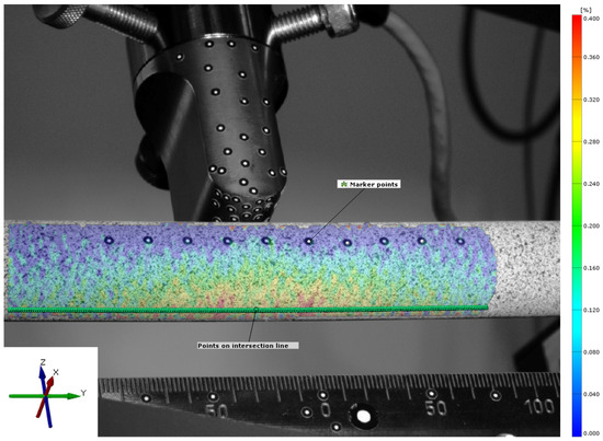 Strain measurement on the stochastic spray pattern based on points along the intersection line. The color coding provides information on the amount and distribution of the tensile strain from 0% strain (blue) to 0.4% strain (red). Attached marker points along the bone tube were used for analysis of the bending curve for FE model validation.