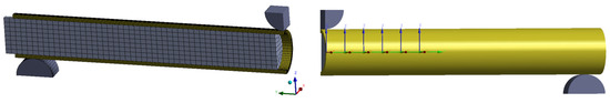 The physical models of the tube and implants were replicated in ANSYS Design Modeler (ANSYS 2022 R1, Canonsburg, PA, USA). Static structural simulations were built with two variations: (a) 3- and 4-point-bending loading case and (b) with and without implants. The load applicator and bearings were modeled as rigid bodies at the same distances as in the experimental part.
