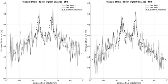 Principal strain for 20 mm interprosthetic distance for 3-point-bending (left) and 4-point-bending (right). The solid lines show the experimental data for two consecutive loading ramps and the dashed line represents the calculation from the FE model.