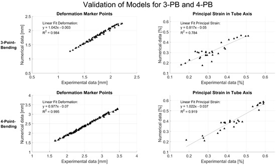 FE model validation over six marker points and principal strain along the tube axis. The model deformations were compared to the experimental data and analyzed using Pearson’s correlations.