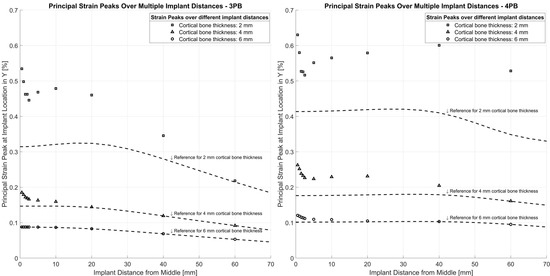 Principal strain peaks at implant position for different cortical bone thicknesses in 3- and 4-point-bending. Due to the symmetry of the model, a distance of 20 mm represents an interprosthetic distance of 40 mm.