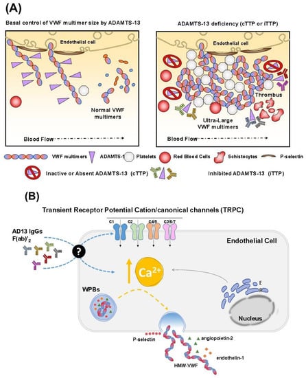Scheme of the canonical (A) and putative (B) mechanisms responsible for the thrombotic phenomena in iTTP and cTTP, occurring at the endothelial level. In the putative mechanism shown in (B), endothelial activation occurs through stimulation of the Ca2+ entry and signaling responsible for the secretion of Weibel–Palade bodies and other biochemical mediators able to activate platelets.