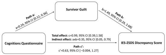 The total effect of CQ on IES-ZSDS scores was significant (c = 0.99, t = 3.32, p = 0.002). The direct effect was not significant (c’ = 0.63, t = 1.99, 95% CI = −0.004, 1.27), suggesting a full mediation effect. Analyses also confirmed the effect of CQ scores on the mediator (survivor guilt; a = 0.24, 95% CI = 0.12, 0.36), and the effect of the mediator on the outcome variable (b = 1.49, 95% CI = 0.29, 2.68), controlling for CQ scores. The model achieved high performance for the combined effect of CQ and survivor guilt scores on the IES-ZSDS discrepancy index (R2 = 0.47, F = 4.56, p = 0.002).