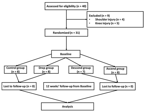 A total of 40 middle-aged Korean women with obesity (mean age, 59.87 ± 2.80 years) agreed to participate in this study. However, only 31 participants were able to complete the 12-week exercise plan. The inclusion criteria were as follows: (1) women aged ≥ 56 years, (2) body mass index (BMI) ≥ 27, (3) fat % ≥ 36, (4) not exercising ≥ 1 once a week, and (5) no experience in resistance exercise. The exclusion criteria were as follows: (1) serious health issues, including cardiovascular disease, psychiatric disorders, and brain-related diseases; (2) any medication for hormones and metabolism; (3) habitual lifestyle problems, including smoking and alcoholism. Of the participants, 9 did not complete the 12-week exercise plan due to shoulder or knee injuries. The participants were randomly divided into the following four groups: control (CON, n = 8), drop set system (Drop, n = 8), descending set system (Descend, n = 7), and ascending set system (Ascend, n = 8). Body composition and blood samples were obtained and evaluated before and after the 12-week intervention. After 12 weeks, all parameters were determined at the same time in the morning after one day to remove the effect of acute resistance exercise and after 12 h of fasting. The resistance exercise groups were subjected to an exercise program (09:30 a.m., 5 days/week, and 60 min/day) that included warm-up (5 min), main exercise (45 min), and cool down (10 min) for 12 weeks. The control group did not participate in any exercise program, and performed their routine (normal) physical activities. All participants were requested to maintain their physical activity and dietary patterns during the intervention. All guidelines for the resistance exercise program was followed using standardized protocols by expert investigators. All participants provided their informed consent before participation. All study protocols adhered to the Declaration of Helsinki and were approved by the institutional review board (05/2021). The flowchart of the study is shown in Figure 1. The characteristics of the participants are presented in Table 1.