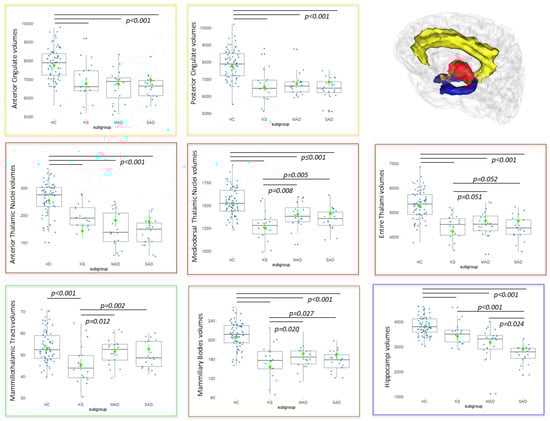 Volumetric comparisons between healthy controls (HC), patients with Korsakoff’s syndrome (KS), moderate Alzheimer disease (MAD) and severe Alzheimer disease (SAD) in several regions of the Papez circuit. In the upper right corner of the figure, regions of the Papez circuit considered in the analysis. Yellow: anterior and posterior cingulate gyri. Red: Thalamus. Blue: Hippocampus. Brown: Mammillary bodies. Green: Mammillothalamic tract. We used a generalized linear model (GLM): estimated marginal means are shown in green with vertical lines showing 95% Confidence Intervals. When F-tests were significant (p < 0.001, corrected for multiple comparisons), post-hoc tests were carried out (Tukey, unequal sample size). Statistically significant post-hoc tests between groups are shown with an overhead horizontal black line and associated p-value shown on the plots. Raw data are also illustrated via boxplots and volumes are expressed in mm3.
