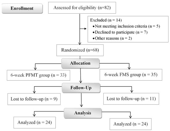 Women with only SUI participated in the study. The inclusion criteria were having an age between 29 and 49 years, complaints of episodes of SUI for at least 4 weeks and women who had at least one vaginal delivery. Subjects were excluded if they were pregnant or were diagnosed with vaginismus, urinary tract infections, cancer, epilepsy, pelvic organ prolapse greater than stage I, skin diseases, had undergone previous pelvic floor surgeries or had a heart stimulator or a metal implant and were unable to contract the PFM. After the gynecological evaluation, 82 participants with SUI were selected, but 14 were excluded because they did not meet the inclusion criteria. Sixty-eight women (in group PFMT n = 35, and in group FMS—n = 33) agreed to participate in the study and only forty-eight (70.6%) fully completed the interventions.
