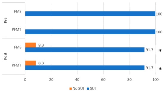 Distribution of study participants according to complaints of SUI pre- and post-interventions. Note: *—p < 0.05 between pre- and post-interventions within groups. PFM, pelvic floor muscle; PFMT, pelvic floor muscle training; FMS, functional magnetic stimulation.