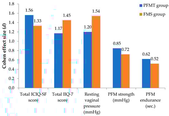 As shown in Figure 4 the effect sizes of both interventions on outcome measures were similar. The large effect size was determined with total ICQ-SF and IIQ-7 scores and resting vaginal pressure in both groups and on PFM strength in the PFMT group. The medium effect size was determined with PFM endurance in both groups and on PFM strength in the FMS group.
