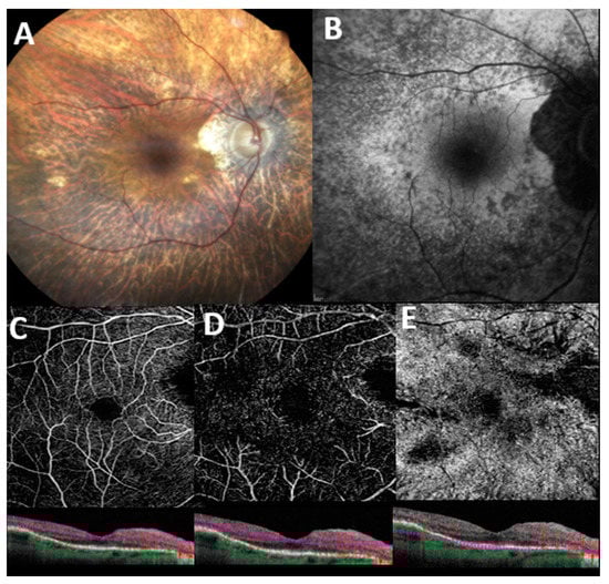 Murro et al. consecutively enrolled 14 eyes of 7 patients with CHM and 14 eyes of 7 healthy controls, demonstrating patients’ significantly smaller FAZ in SCP and DCP (19,899 ± 8368 and 24,398 ± 86,11, respectively) when compared to controls (288,708 ± 4505 and 32,016 ± 4821, respectively) [41]. Quantitative analysis also disclosed statistically significant decreased SCP, DCP, and CC vascular densities, comparing patients with the age-matched control groups [41]. The same authors also explored OCT-A features of 6 CHM carriers (12 eyes), comparing their findings with 8 age-matched controls (16 eyes) [42]. The quantitative analysis of the inner retinal vasculature disclosed no significant differences in both SCP and DCP vessel densities compared to the control group [42]. Only CC showed a mild reduction in the vascular flow in the carrier versus control group (78.896 ± 13.972 vs. 80.008 ± 10.862; p = 0.045) [42]. Of note, OCT allowed the identification of the impaired RPE layer in the presence of a preserved central inner retinal and CC vascularization, suggesting that vascular impairment would follow RPE loss in the natural history of the disease [42].
