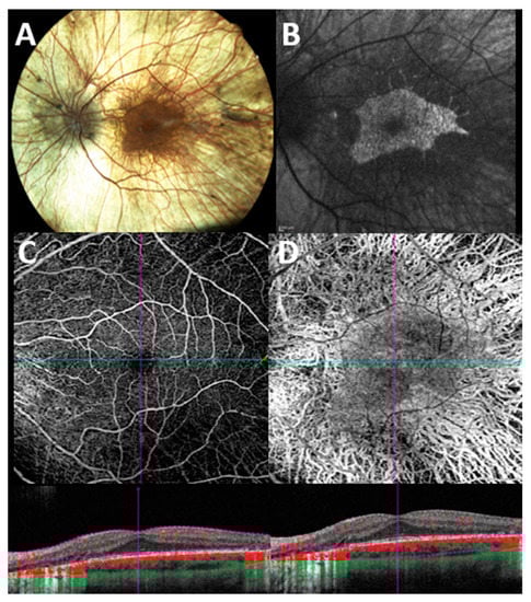 - Ranjan, R.; Verghese, S.; Salian, R.; Manayath, G.J.; Saravanan, V.R.; Narendran, V. OCT Angiography for the Diagnosis and Management of Choroidal Neovascularization Secondary to Choroideremia. Am. J. Ophthalmol. Case Rep. 2021, 22, 101042. [Google Scholar] [CrossRef]