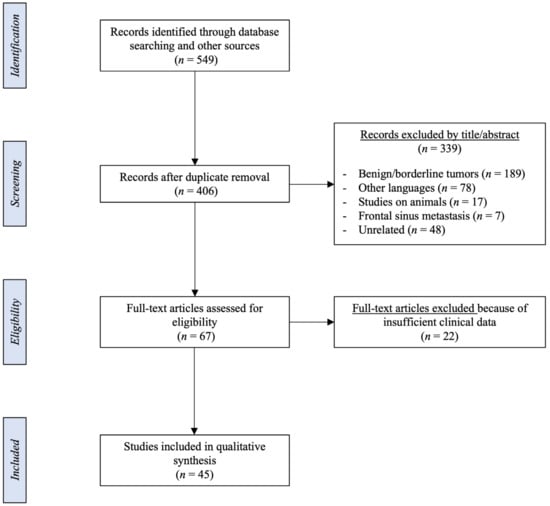 The PICOS (Participants, Interventions, Comparisons, Outcomes, and Study design) criteria utilized were as follows: Participants (P), patients with a primary malignant tumor of the frontal sinus or with secondary involvement of the sinus; Intervention (I), surgical (either open or transnasal endoscopic approaches) or non-surgical treatment; Comparator (C), observation; Outcomes (O), survivals and recurrence rates; and Study design (S), retrospective and prospective cohort studies. Relevant keywords, phrases, and medical subject headings (MeSH) databases were used according to each database’s requirements. The following is an example of a search strategy used for PubMed/MEDLINE: ((“Nose Neoplasm”[Title/Abstract] OR “Nasal Neoplasm”[Title/Abstract] OR “Neoplasm Nasal”[Title/Abstract] OR “Cancer of Nose”[Title/Abstract] OR “Nose Cancer"[Title/Abstract] OR “Cancer Nose”[Title/Abstract] OR “Nasal Cancer”[Title/Abstract] OR “Cancer Nasal”[Title/Abstract] OR “Cancer of the Nose”[Title/Abstract])) AND ((“Frontal Sinus”[Mesh]) OR ((“Frontal Sinus”[Title/Abstract]) OR (“Sinus Frontal”[Title/Abstract]))) AND (2000:2023[pdat]). The “cited by” function in Google Scholar was used to identify additional articles. The last search was performed on 7 January 2023. Two independent authors (G.S. and M.V.) conducted the electronic search. The following inclusion criteria were considered: full English language text, primary malignant tumors arising from or extending into the frontal sinus, and available individual patient data. Exclusion criteria were as follows: benign and/or borderline sinonasal tumors, a metastatic disease involving the frontal sinus, scientific articles on animals, articles with missing data, database-based review of cases, and full-text not available. After the removal of duplicates, all titles and abstracts were evaluated using the inclusion and exclusion criteria. The full texts of the remaining articles were scrutinized in their entirety to determine final eligibility. At the abstract review stage, we included all studies deemed eligible by at least one author. At the full-text review stage, disagreements were resolved by consensus. The included articles were examined for data extraction, including the number of patients treated, age, sex, site of origin, histology, staging, treatment, and follow-up status.