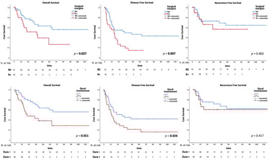 Univariate analysis: Kaplan–Meier curves for overall survival (OS), disease-free survival (DFS), and recurrence-free survival (RFS) according to the status of surgical margins and dural involvement. Bold values are statistically significant.