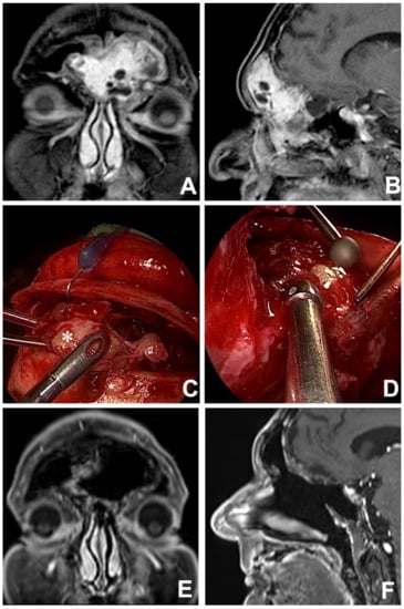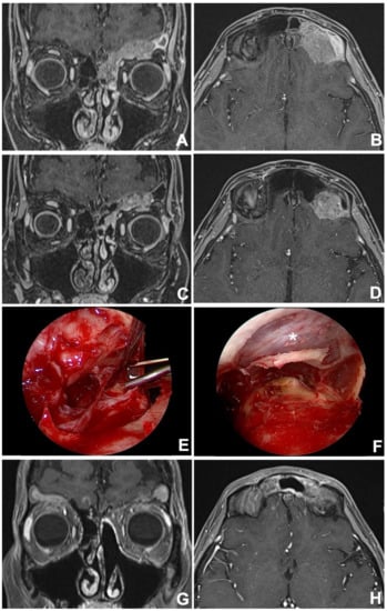 - Alvi, M.I.U.R.; Pathmanaban, O.; Bhalla, R.; Mani, N. Recurrence of a complex anterior skull base tumour managed with an uncommon surgical approach. BMJ Case Rep. 2019, 12, e228622. [Google Scholar] [CrossRef]