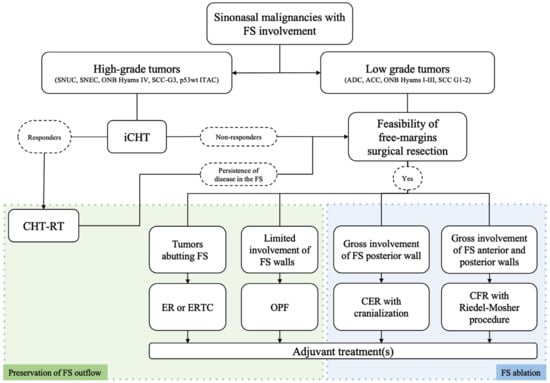 Flowchart of the study protocol, describing the multimodal treatment algorithm for the management of the malignancies involving the frontal sinus. The response rate to induction chemotherapy was defined according to the RECIST 1.1 criteria []. Abbreviations: ACC, adenoid cystic carcinoma; ADC, adenocarcinoma; BSC, best supportive care; CER, cranio-endoscopic resection; CFR, craniofacial resection; CHT, chemotherapy; EER, endoscopic endonasal resection; ERTC, endoscopic resection via transnasal craniectomy; FS, frontal sinus; iCHT, induction chemotherapy; ITAC, intestinal-type adenocarcinoma; OPF, osteoplastic flap; RT, radiotherapy; SCC, squamous cell carcinoma; SNEC, sinonasal neuroendocrine carcinoma; SNUC, sinonasal undifferentiated carcinoma.