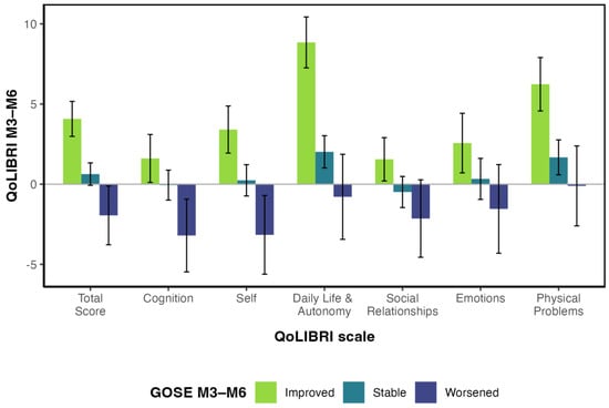 The average scores for the change in the QoLIBRI in relation to the change in the GOSE scores are shown in Figure 2. The most pronounced increase in the QoLIBRI score in relation to the GOSE score was observed in the Daily Life & Autonomy scale, followed by the Physical scale for those with improved functional recovery. For those with a worsened recovery status, the greatest decrease in the QoLIBRI scores was found in the Cognition and Self scales.