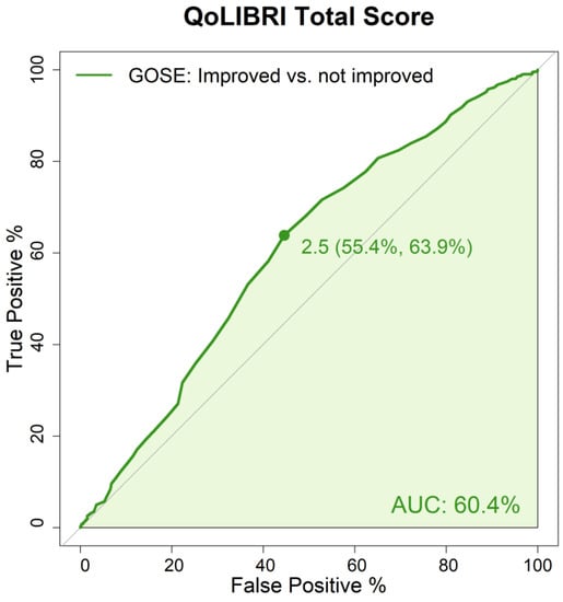 ROC analysis result for the QoLIBRI total score change in relation to the change in the GOSE score (improved vs. not improved).