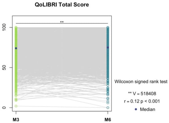 Differences in the QoLIBRI total score from three (M3) to six (M6) months after TBI. Note. ** significant at α = 0.05, V = Wilcoxon test statistic, r = effect size with the following classification: 0.10 ≤ r < 0.30 (small effect), 0.30 ≤ r < 0.50 (medium effect), and r ≥ 0.50 (large effect), p = p-value.