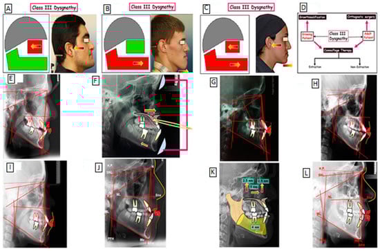 Class III skeletal malocclusion phenotype is characterized by maxillary (midface) retrusion (A), mandibular protrusion (mandibular prognathism; (B), a combination of maxillary retrusion and mandibular protrusion (mandibular prognathism; (C). Treatment strategies for Class III dysgnathy (D). Treatment of Class III dysgnathy in the growing age through growth influencing methods (E–G): before treatment (E); use of devices to influence growth (F); after treatment (G). Camouflage therapy of Class III dysgnathy by extraction of permanent teeth (H,I): before treatment (H); after treatment (I). Combination therapy (orthodontics and surgery) of Class III dysgnathy (J–L): before treatment (J); Simulation of surgical maxillary-mandibular movement (K); after treatment (L).