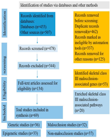 The PRISMA guidelines for systematic meta-analyses and reviews, the 2009 checklist, and the GRADE guidelines, were all adhered to in this study. From early 1990 to January 2022, we looked for reports that described the genetic or epigenetic aspects of skeletal malformations and malocclusions. Using the following criteria for inclusion, we found studies that were appropriate: (1) original research or meta-analysis; (2) English language writing; (3) Human skeletal Class III; (4) Genetics of Human skeletal Class III; (5) QTL mapping and gene association with human skeletal Class III; and (6) enriched skeletal Class-III-malocclusion-associated pathways. The following studies were excluded from consideration: (1) mammal, histopathologic, in vitro, or computational studies; (2) reviews; (3) transcriptomic or expression studies without epigenetic/genotyping analysis; (4) reports focusing on other conditions and malocclusions were simply discussed; and (5) reports for which we did not have access to the full text or that were written in another language.
