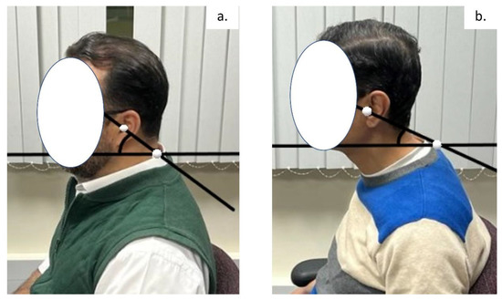 The CVA is reliable and valid for the assessment of FHP [25]. The CVA is measured as the angle of intersection between a horizontal line and a line bisecting the tragus of the ear and the C7 spinous process. We followed a previously published protocol for the measurement of the CVA in a neutral, relaxed sitting position [26]. Lateral photographs of each participant were taken with the instructions for them to be seated in a comfortable, relaxed, and neutral position. A tripod, with a mounted digital camera positioned 0.8 m from the sitting participant, was placed perpendicular to the sagittal plane of the participant. The height of the camera was set at the height of each person’s seventh cervical vertebra. To identify the tragus of the ear and the 7th cervical spinous process, adhesive markers were fixed on these two landmarks, which then allowed the measurement of the CVA on the photographs. Figure 1 depicts the CVA measurement used with a representative participant with (a) normal head posture and (b) considerable forward head posture (FHP).