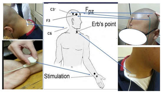 For recording, all somatosensory evoked potential (SEP) recording electrodes (7 mm Ag-AgCl disposable adhesive electrodes from Neurosoft) were placed according to the International Federation of Clinical Neurophysiologists’ (IFCN) recommendations [21,27]. Careful attention was paid to cleaning and scarifying the skin before the attachment of the recording electrodes on the scalp. Using an impedance below 5 kΩ, recording electrodes were placed over the ipsilateral Erb’s point, superficial to the sixth cervical vertebra spinous process (Cv6). Additional recording electrodes were placed at the frontal and parietal scalp regions contralateral to the side of stimulation at 2 cm posterior to the contralateral central and frontal scalp cites C3/4 and F3/4, which are referred to as Cc′, and Fc′, respectively. Frontal and partial recording electrodes were referenced to the ipsilateral earlobe [27]. The C6 spinous electrode was referenced to the anterior neck (tracheal cartilage). The Erb’s point electrode was also referenced to the contralateral shoulder, as SEP components originating from subcortical regions are best recorded with a non-cephalic reference [21,28]. A ground electrode was attached to the forehead FPz. Figure 2 demonstrates this procedural setup.