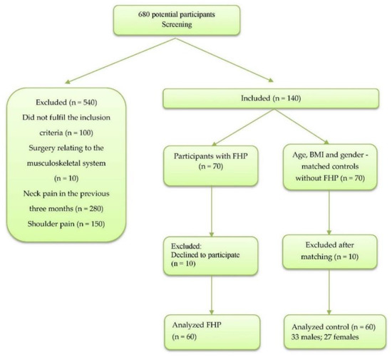 Initially, 680 potential participants were screened. Neck pain and shoulder pain were the most common reasons for participant exclusion. Sixty participants with FHP (mean age 23.5 years, SD = 2; 35 males, 25 females) and sixty age-, BMI-, and sex-matched controls without FHP were recruited. Figure 3 shows the participant flow chart.
