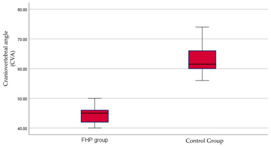 Box and whiskers for craniovertebral angle (CVA) between the forward head posture (FHP) and control groups.