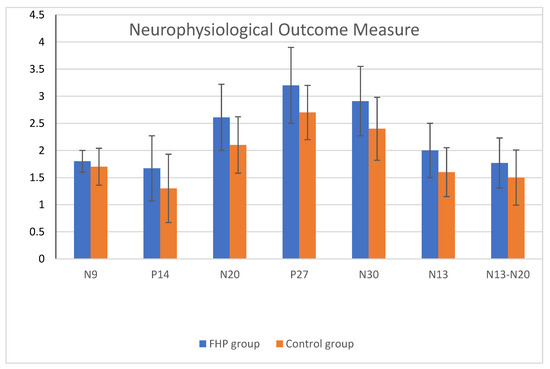 Neurophysiological outcomes for both groups. FHP = forward head posture and Control group = normal head posture group as measured with the CVA. Statistically significant differences between the FHP and control groups for all measured neurophysiological variables were identified, including amplitudes of spinal N13 (p < 0.005), brainstem P14 (p < 0.005), parietal N20 and P27 (p < 0.005), frontal N30 (p < 0.005), and N13–N20 interpeak latency as measures of central conduction time (CCT) (p = 0.004). There was no significant difference between both groups regarding the amplitudes of the peripheral potential N9 (p = 0.07).