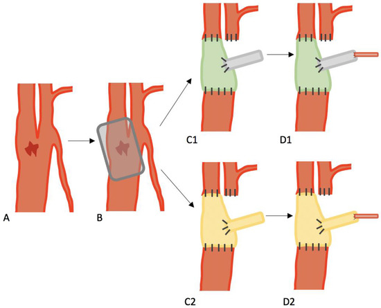 (A) Shows the typical location of carotid blow-out syndrome, which is often located at the junction of the CCA and ICA. (B) Shows the resected portions of the CCA, ICA, and ECA. (C1,C2) Illustrates the different reconstruction techniques: (C1) with a xenogenic graft (green) combined with an autologous second graft (grey); (C2) with an autologous graft (yellow) combined with an autologous second graft (yellow); (D1,D2) shows the anastomosis of the autologous graft (grey in (D1) and yellow in (D2)) with the arterial branch of the graft.