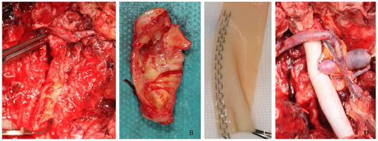 (A) Shows the intraoperative situation of the ruptured CCA near the bifurcation. (B) Resection of the CCA and the bifurcation to the ECA/ICA. (C) Individually table-made xenogenic interponate. (D) Anastomosed graft to the ICA/CCA with an additional graft for the microvascular free flap artery.