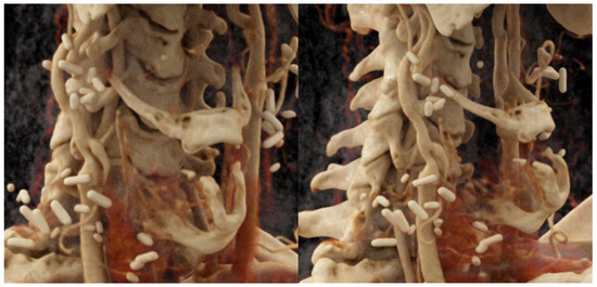 Carotid artery rupture occurs mainly in the common carotid artery (CCA), near the bifurcation (60–70% of cases). A much smaller proportion also occurs in the internal carotid artery (ICA) [6,7,8]. In general, CBS is more common in atherosclerotic vessel segments with stenosis [9].