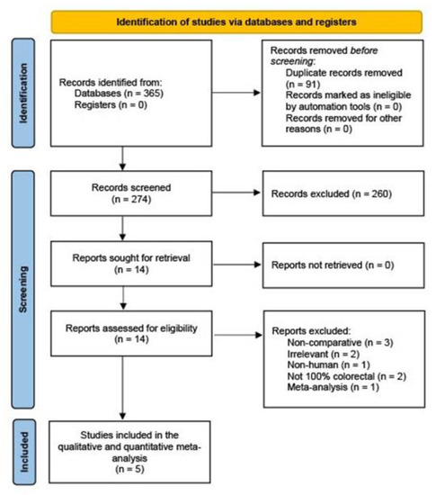 The initial database search using the predefined keywords yielded 365 potentially relevant abstracts. Of these, 14 full-text articles were screened for eligibility and finally 5 non-randomized observational studies (1 multi-center prospective and 4 single-center retrospective) comparing the outcome of neuromuscular blockade reversal with sugammadex and acetylcholinesterase inhibitors were included in the qualitative and quantitative data analysis [24,25,26,27,28]. The PRISMA flowchart for the literature search is shown in Figure 1. Of the total 1969 patients included (1114 men/855 women), 1137 were assigned to the sugammadex group and 832 were assigned to the acetylcholinesterase inhibitor group (control). Two studies used pyridostigmine as the acetylcholinesterase inhibitor [24,26], and three studies used neostigmine [25,27,28]. Three studies included both malignant and non-malignant cases [25,27,28], while two studies included only patients with colorectal cancer [24,26]. The rate of laparoscopic surgery ranged from 20–100% in the sugammadex group to 22–100% in the control group. Inpatient [25,26] and up to 30 days [24,27,28] follow-up data were presented. The study by Serrano et al. [27] was a prespecified substudy of the POWER trial [29]. Table 1, Table 2 and Table 3 provide a detailed summary of the study and clinical characteristics.