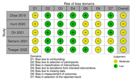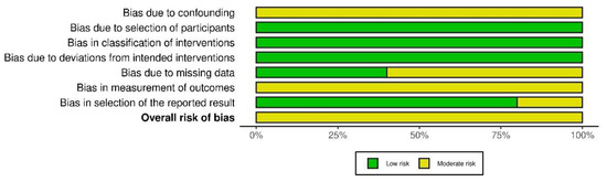 Summary of risk of bias and graphical representation of included studies [24,25,26,27,28] based on the ROBINS-I tool.