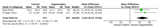 Time to first bowel movement or flatus as the primary endpoint was reported in two studies with 559 patients [25,28]. In the sugammadex group, the time to first postoperative bowel movement or flatus was significantly shorter than in the control group (SMD 13.01, 95% CI 6.55–19.46, p < 0.0001). Importantly, heterogeneity was low (I2 = 0%, Chi2 test: p = 0.58) (Figure 3).