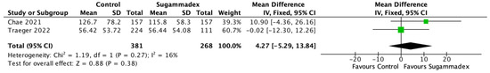 Forest plot comparing time to first oral food intake between sugammadex and control from the studies published by Chae et al. [24] and Traeger et al. [28].