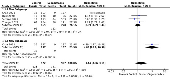 Postoperative ileus was reported in four studies [24,25,27,28]. A meta-analysis of the pooled data showed no significant difference between the sugammadex and acetylcholinesterase inhibitor groups in terms of postoperative ileus rate (OR 1.44, 95% CI 0.66–3.11, p = 0.36). The data for this outcome were highly heterogeneous (I2 = 81%, Chi2-test: p = 0.001). The source of heterogeneity was identified in the study by Chae et al. [24]. However, the subsequent subgroup with low heterogeneity (I2 = 2%, Chi2 test: p = 0.36) still demonstrated no difference in the reported ileus rates between both groups (OR 0.99, 95% CI 0.69–1.44, p = 0.97) (Figure 5).